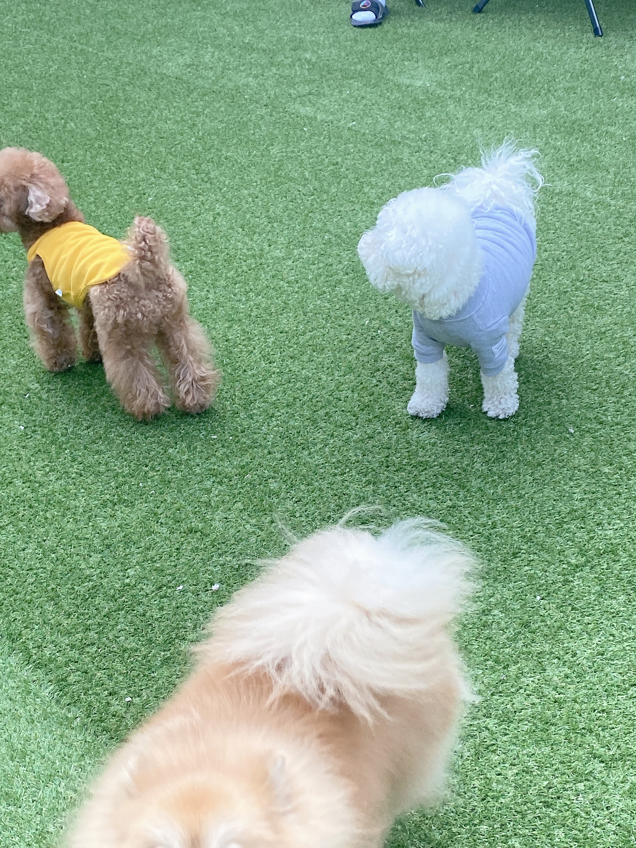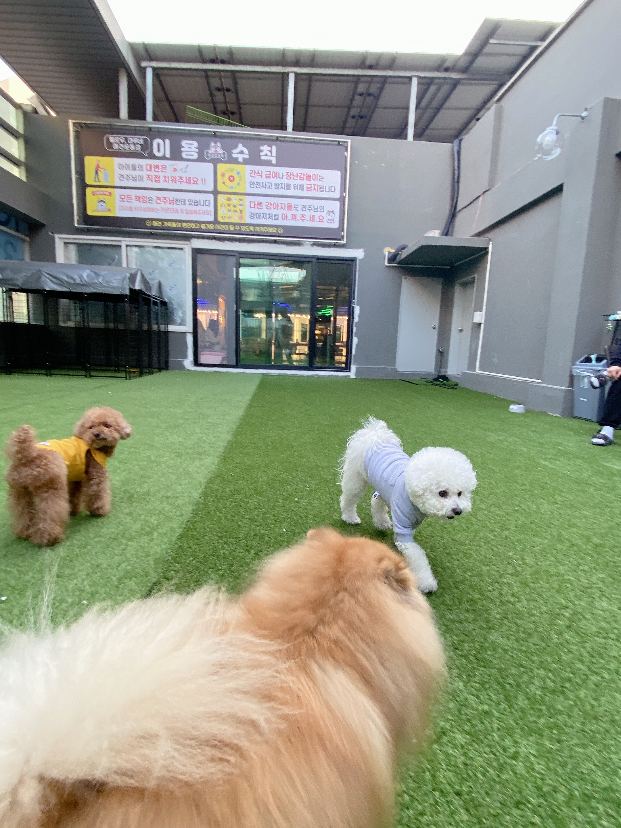 애견카페 오면 신나게 뛰뛰하고 친구들이랑 똥꼬 냄새도 맡으러 댕기고 산책할때랑 또 다르게 엄청 좋아해서 제가 덩달아 행복해요 !